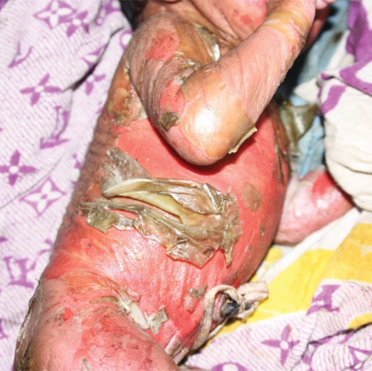 A skin biopsy would have given the ultimate confirmation of the diagnosis, but as in many district hospitals a lack of resources impaired proper histopathological analysis. Despite the lack of a precise diagnosis all specialists underlined the dehydration and infection risks of a major skin defect. Therefore they advised adequate hydration, systemic antibiotic treatment and topical treatment for the skin defects as if they were burns.
