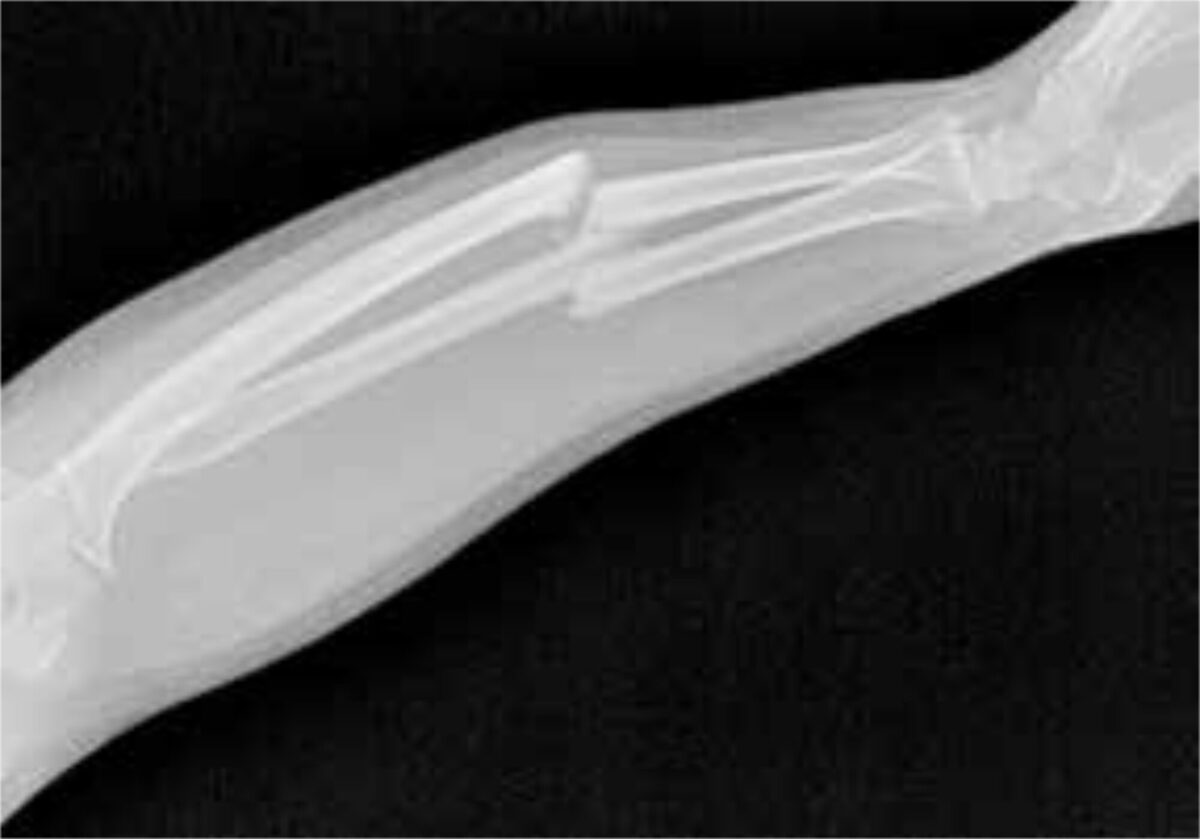 Nine weeks after surgery the POP was removed. Clinically the ulna was reunited, but the radius was not, probably due to misplacement and removal of the metal pin.