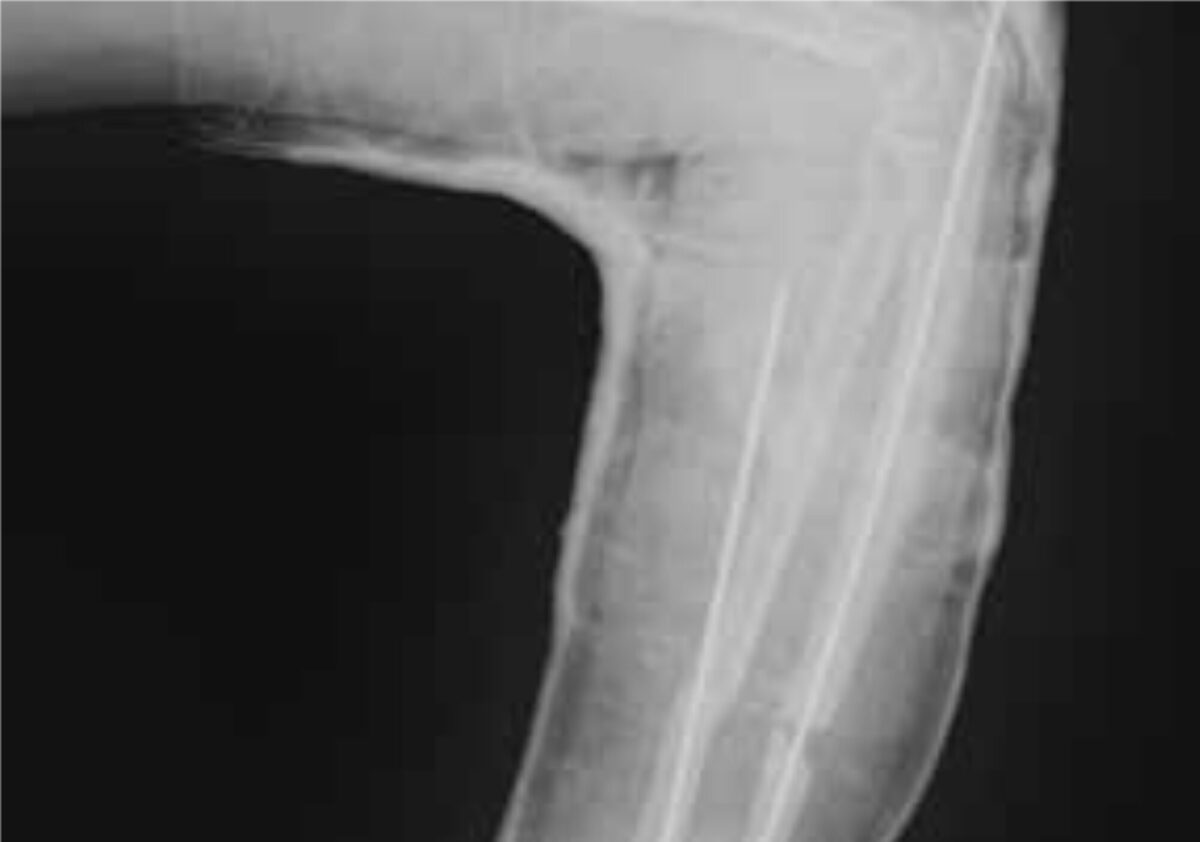 A 29-year-old man presented at the outpatient clinic with a small bandage on his left arm; he had injured his arm three months before in a motorcycle accident. He had first gone to the traditional healer, but after three months there was no significant improvement. Upon clinical examination abnormal mobility was felt midway in his lower left arm. No wounds or scars were observed and his left hand had normal function. The X-ray showed a midshaft fracture of both ulna and radius (figure 1). Initially plaster of Paris (POP) was applied under traction for three weeks to improve position.