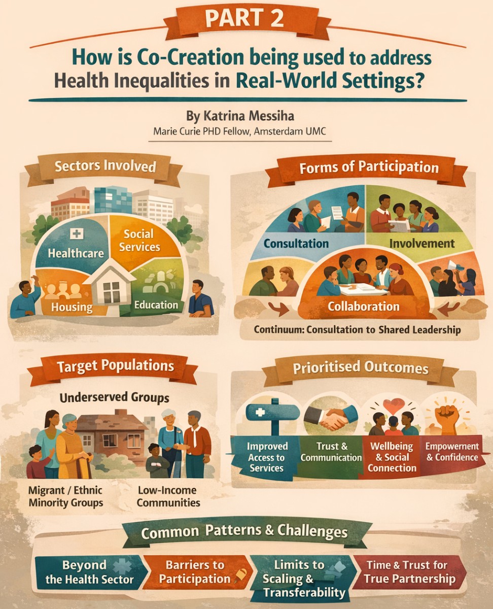 Health inequalities are rarely the result of a single factor. [1] They emerge through interactions between social conditions, economic circumstances, environments and health systems. [2] Interventions developed without meaningful engagement of affected communities often fail to capture this complexity. Co-creation approaches attempt to address this gap by engaging stakeholders directly across planning, conducting, evaluating and reporting research and practice-based initiatives. [2,3] Both in research and practice, co-creation is being applied in several ways to address inequalities.
