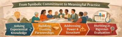 clearly defining the roles of different stakeholders, engaging communities at multiple stages of the process – from identifying priorities to shaping implementation and evaluation – and creating mechanisms through which their input can meaningfully influence decisions. It also entails allocating sufficient time and resources for relationship-building, ensuring