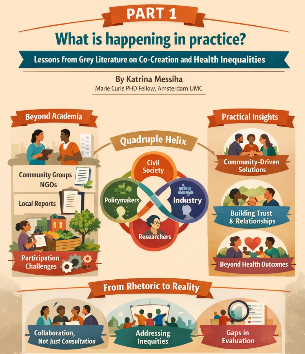 The grey literature suggests that co-creation is already widely used in efforts to address health inequalities, but its implementation may vary considerably in depth and quality. The evidence points to a gradual shift away from purely top-down approaches towards more collaborative models, while also revealing persistent gaps between aspiration and practice.