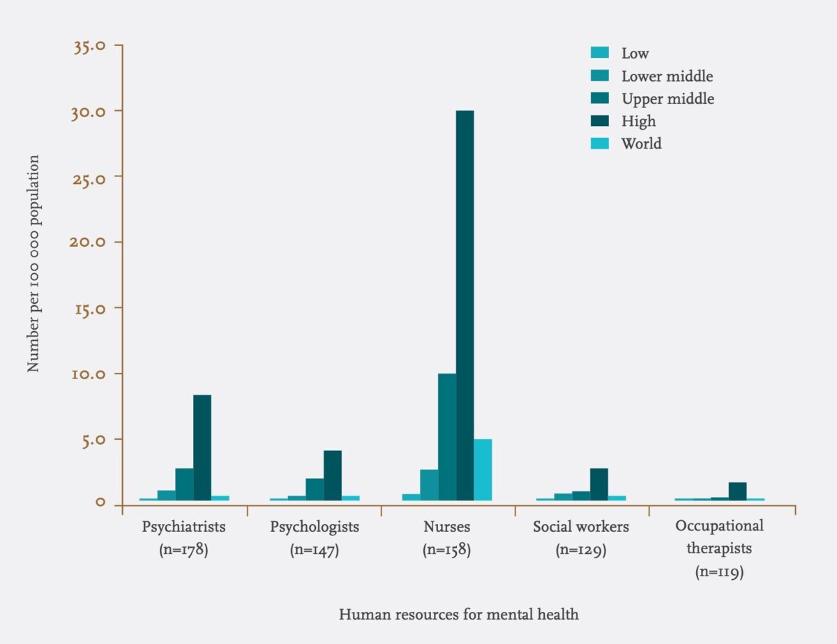 The website of the World Health Organization (WHO) on the WHO Mental Health Gap Action Programme (mhGAP) opens by stating that “mental, neurological, and substance use disorders are common in all regions of the world, affecting every community and age group across all income countries. While 14% of the global burden of disease is attributed to these disorders, most of the people affected – 75% in many low-income countries – do not have access to the treatment they need”. The term ‘gap’ refers to this lack of available services. The relative lack of mental health professionals in low- and lower-middle-income countries, as shown in figure 1, may serve as an illustration.