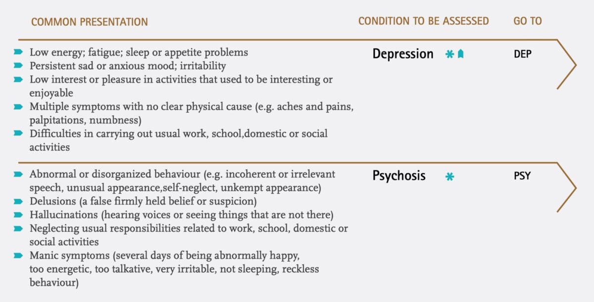 As if the editors wanted the Guide itself to underline this statement, its design is a soon to be classical example of user-friendliness. The health worker is first guided through a Master Chart listing the common presentations of all established priority conditions. As an example, figure 2 shows the Depression and Psychosis sections of this Master Chart. If features of one condition are present, the condition should be assessed; the worker is then guided to the module addressing that condition.